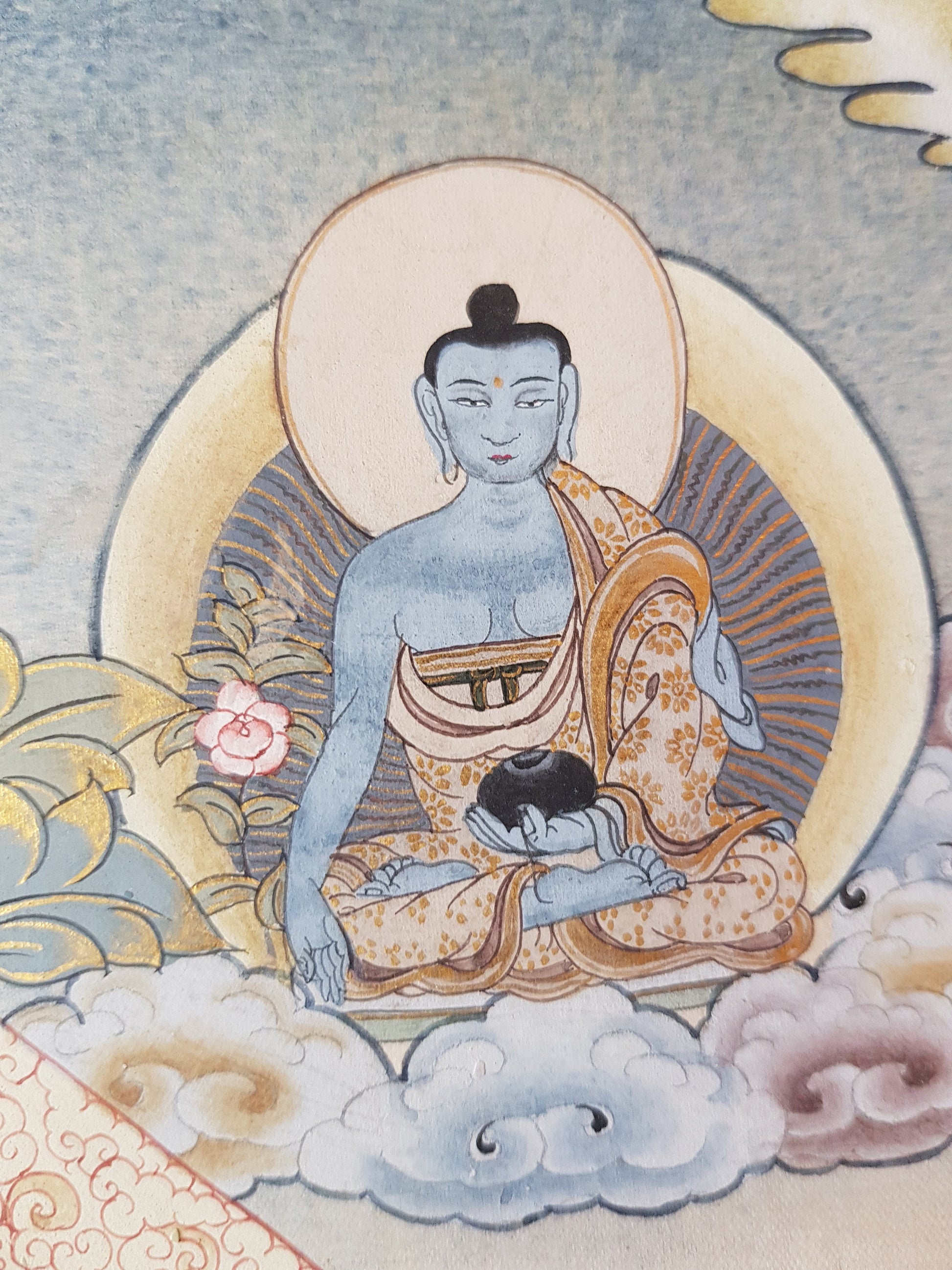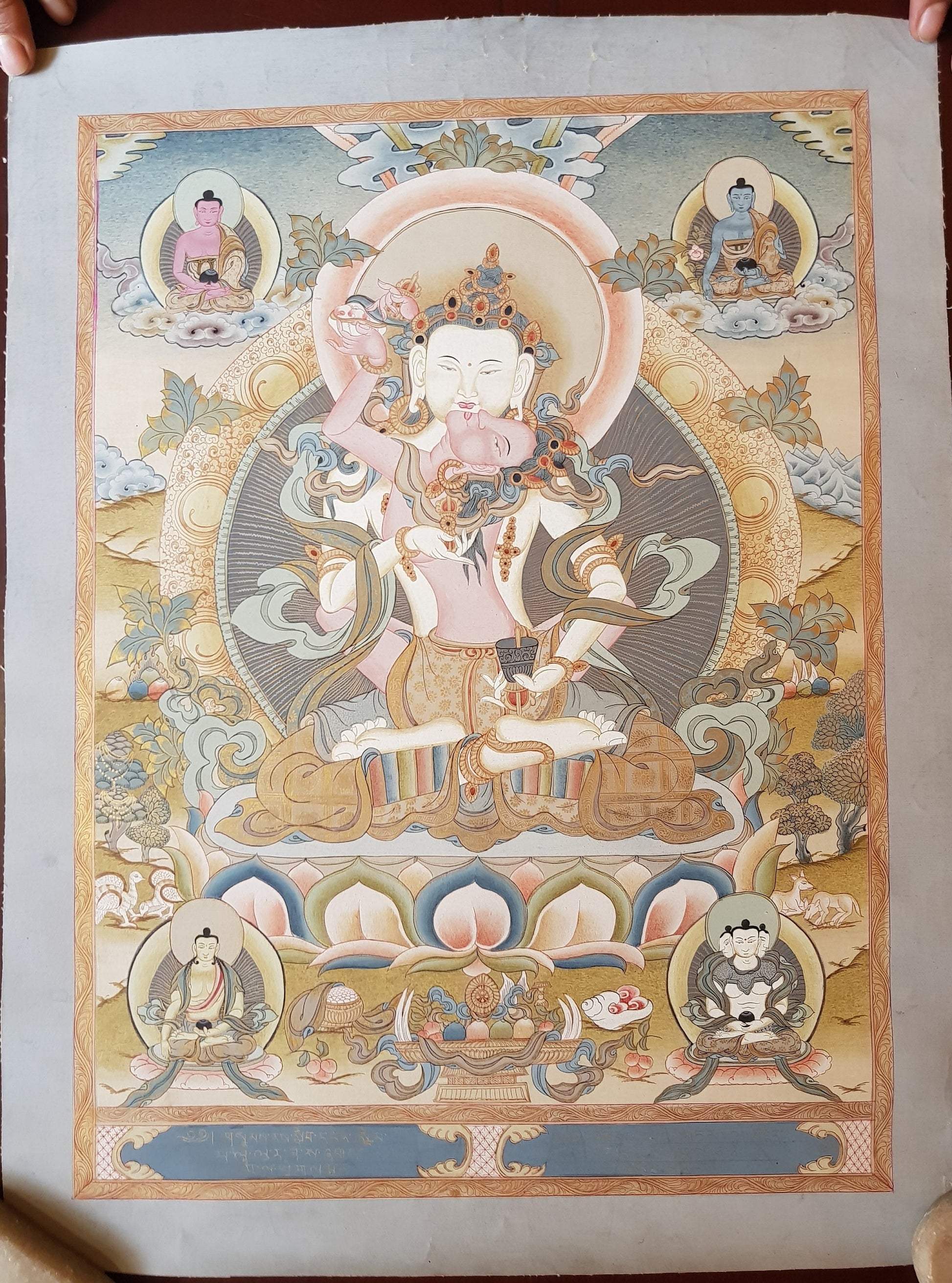 Vajrasattva with consort (Tibetan: dor je sem pa yab yum. English: Vajra Hero Father-Mother), the buddha of purification, essence of all the peaceful Buddha. Vajrasattva represents the principle of purification and is a supreme Buddhist deity who delineates the purity of the enlightened mind. He manifests the purity of speech, mind and body. With one face and two hands, white in colour, the buddha Vajrasattva holds in the right hand an upright gold vajra to the heart and with the left an upturned bell, with a vajra handle, at the left hip. Adorned with elaborate jewel and gold ornaments, a crown, earrings, necklace, bracelets and the like, he wears a long green silk scarf and various multi-coloured silks as a lower garment. With the back swaying slightly to the left and both legs placed in vajra posture the consort Vajragarvi is seated in the lap with the legs entwining the Lord. Gazing up, with one face and two hands, naturally pinkish in appearance, she embraces the Lord with a skullcup in the left hand; adorned with similar jewel ornaments and coloured silks. The two faces are surrounded by a dark green aureole and from the body fine rays emanate to form a nimbus of orange light against a background of swirling cloud and rainbow lights. Both are seated on a white moon disc above a multi-coloured lotus blossom on a ground strewn with precious objects and wish-fulfilling jewels.
