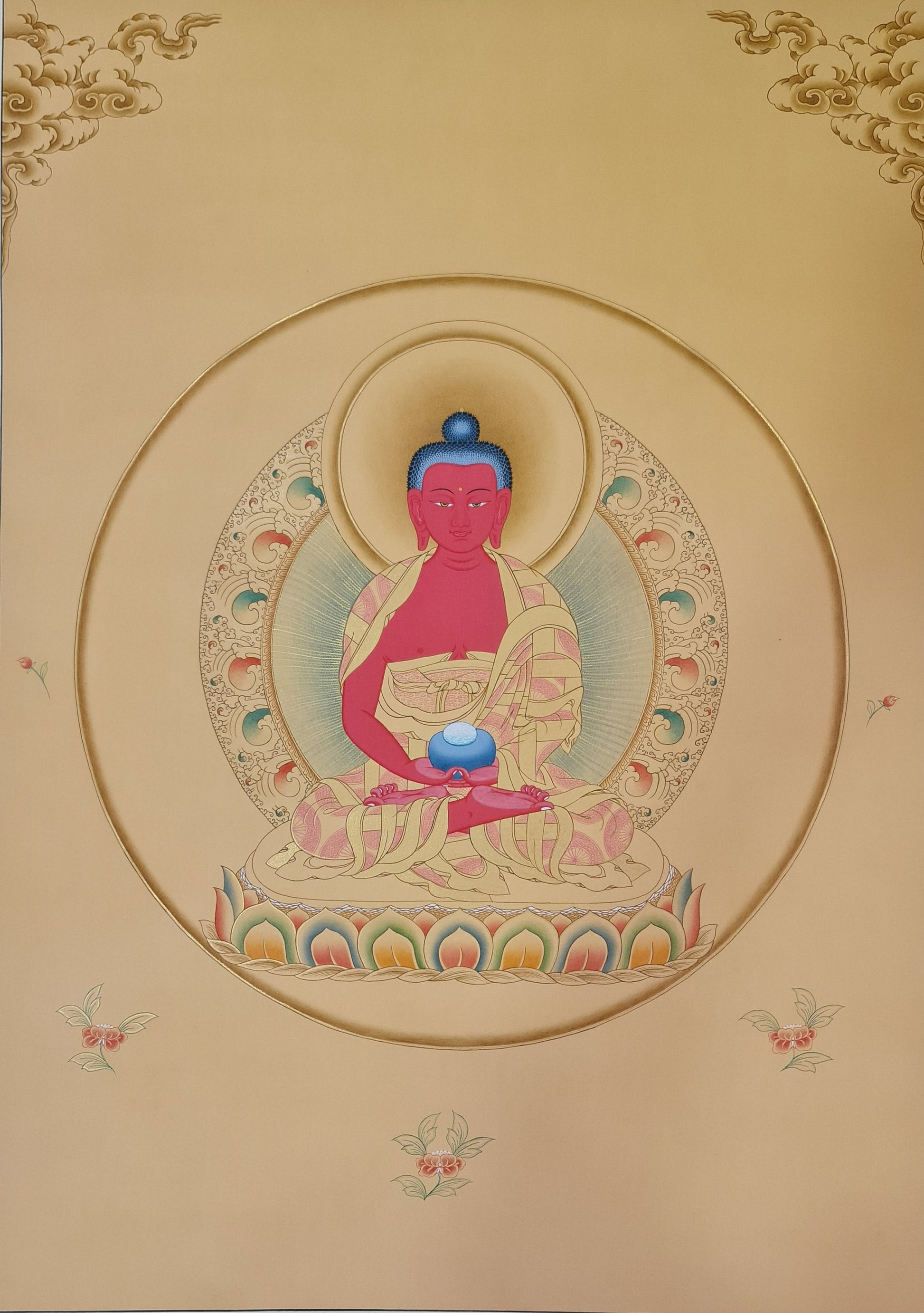 As a bestower of longevity, Amitabha is called Amitayus, or “Infinite Life.” In China and Japan the two names are often used interchangeably, but in Tibet the two forms are never confounded, and Amitayus is worshiped in a special ceremony for obtaining long life. He is depicted wearing ornaments and a crown and holding the ambrosia vase from which spill the jewels of eternal life.