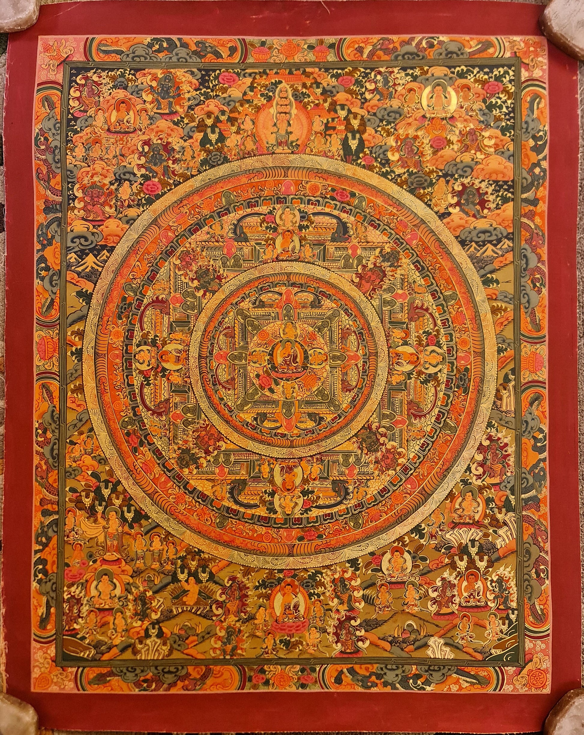 In Tibetan Buddhist practice, mandalas represent the pure and sacred space consecrated by the power of a buddha or other deity. Through concentrated meditation on the mandala, a monk learns information about the deity that is conveyed in the art. Beyond this, he strives to “enter” the mandala, not only invoking the qualities of the deity, but internalizing them himself. A mandala is a representation of the cosmic, the universe, in a circular pattern which leads to a central point. As such, it is a symbol or wholeness, of beginning and end.