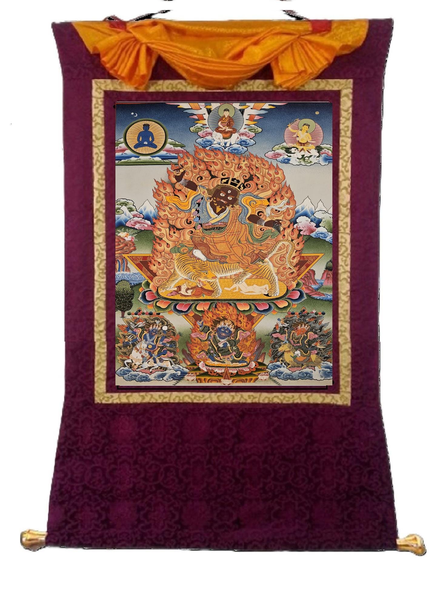 Dorje Drolo is dark-red or maroon in colour and terrifying in appearance, as if the three worlds were on fire. His presence is overwhelming, with a radiance that outshines the sun and moon, while his three round red wisdom eyes stare in every direction. He expresses his wrath by biting down upon his lower lip with his sharp upper teeth and fangs, his orange facial twists upwards and emits fiery sparks, and his matted hair-locks hang down as a tawny mass of curls.