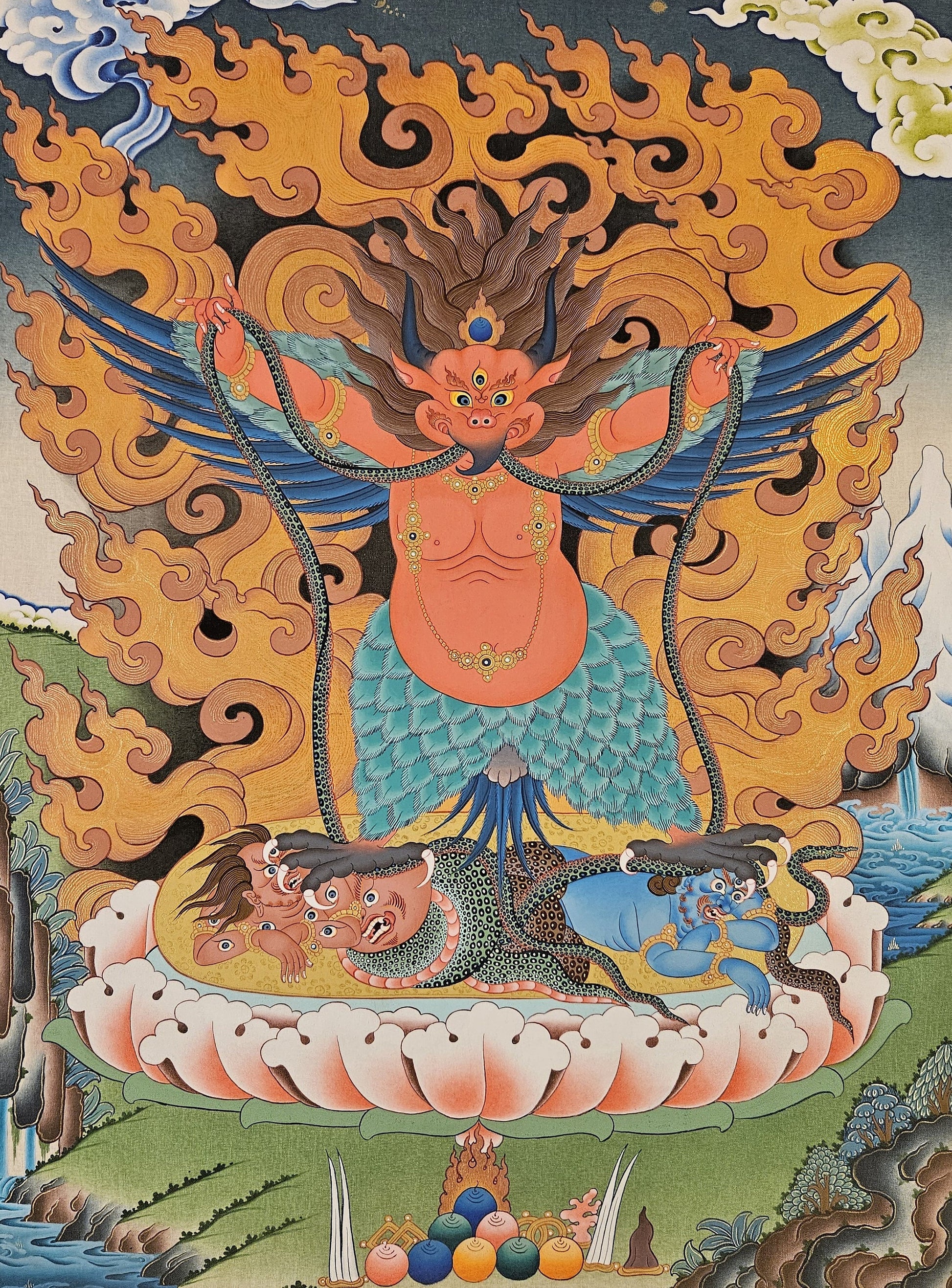 In Tibetan Buddhism, the garuda is one of the Four Dignities—animals that represent characteristics of a bodhisattva. The four animals are the dragon representing power, the tiger representing confidence, the snow lion representing fearlessness, and the garuda representing wisdom.