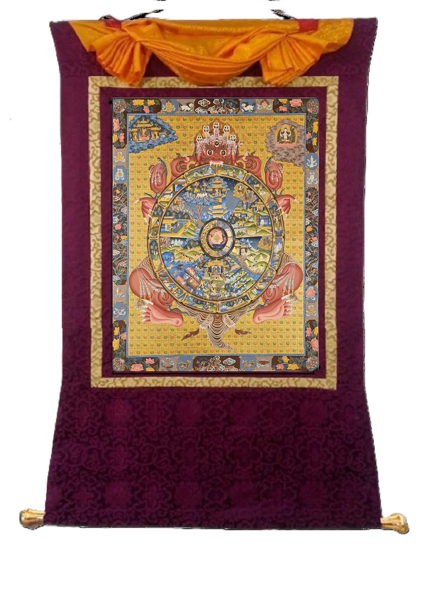 384. 20 Year Old Wheel of Life (Samsara) Thangka (Thanka). Free Brocade / Free Shipping.