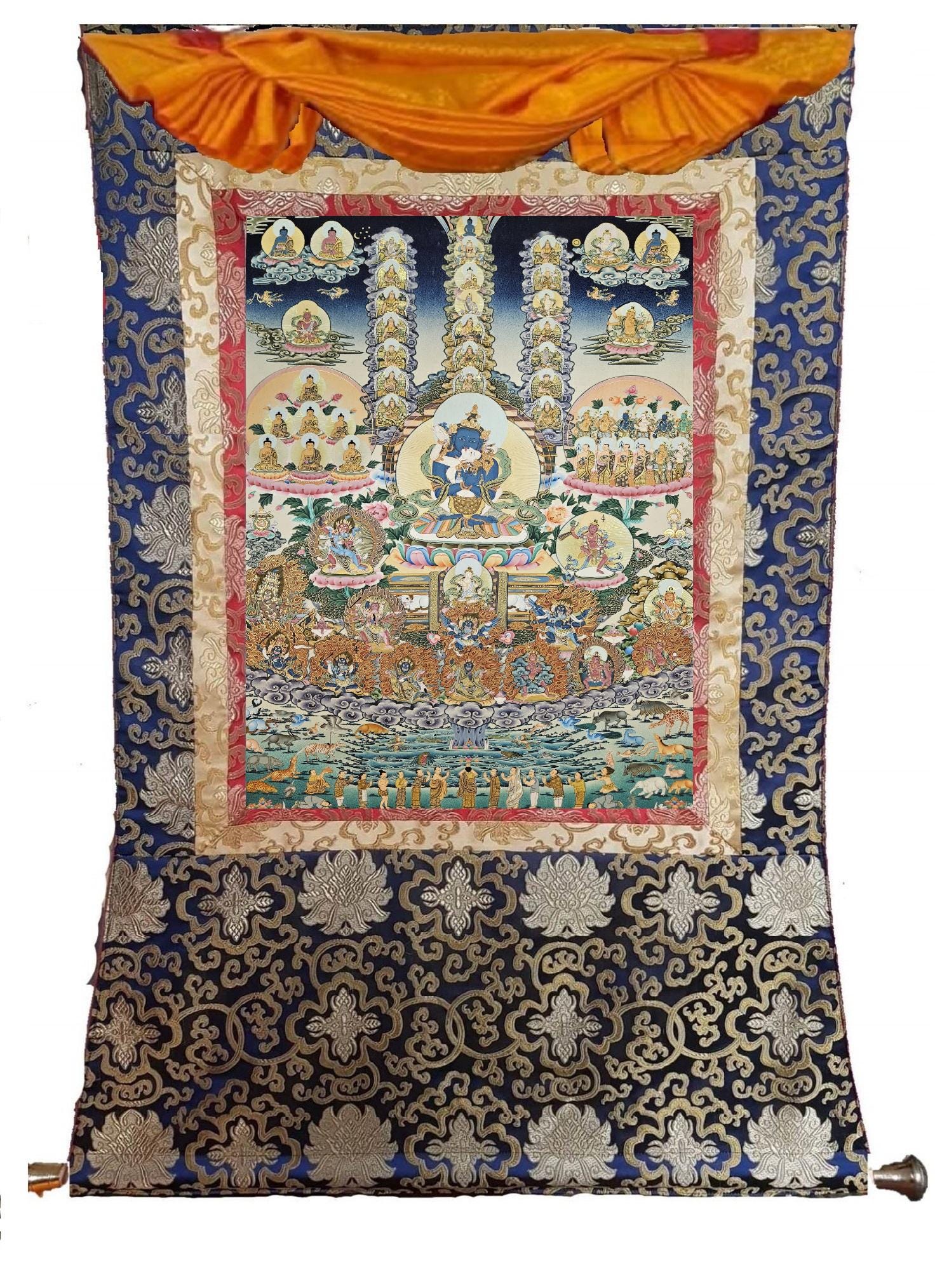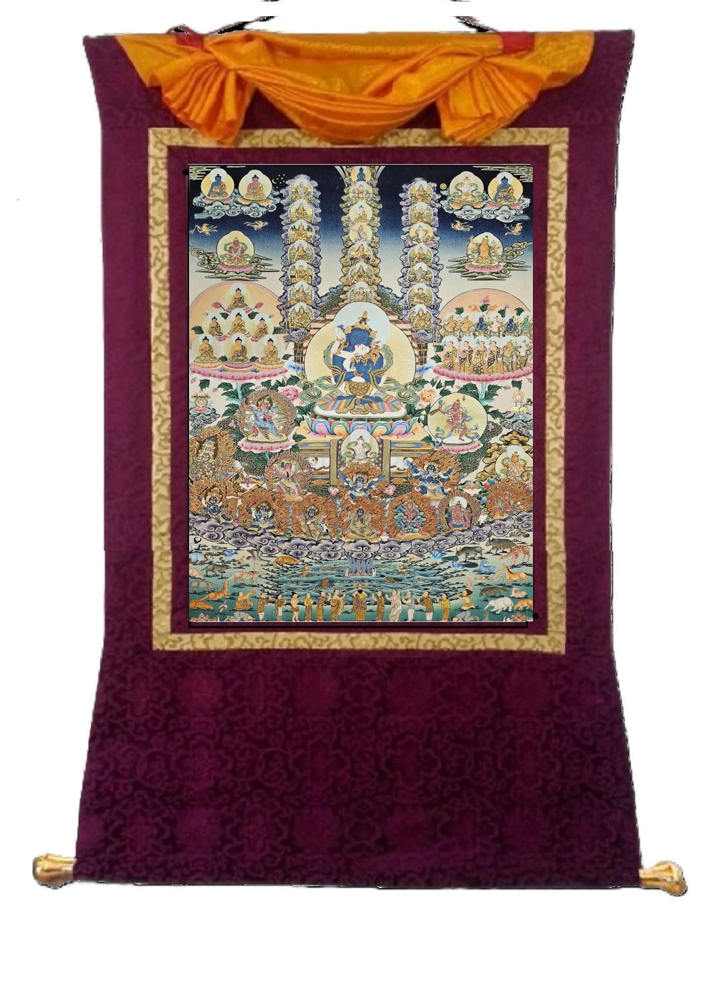 391. Nyingma Lineage Tree with Guru Orgyen Dorje Chang in the Center Thangka (Thanka) Painting with 24 K Gold. Free Brocade / Free Shipping.