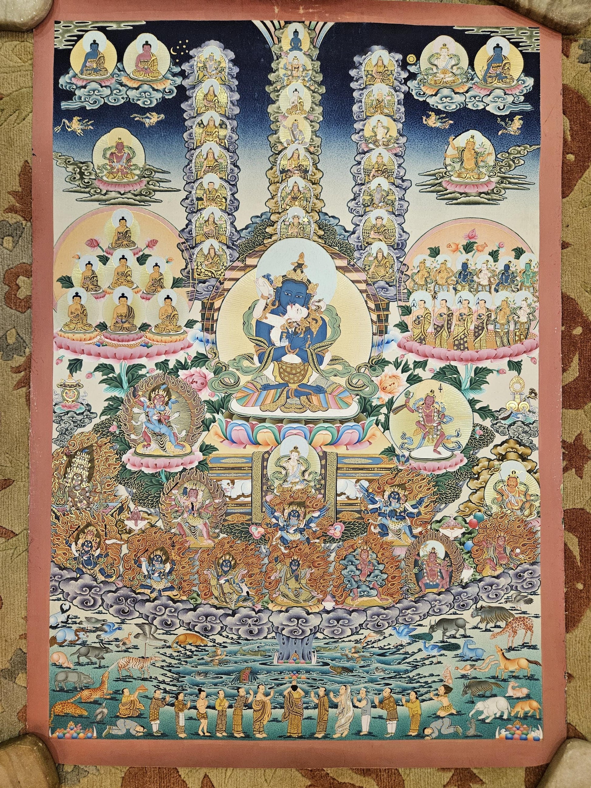 In the sky directly above Padmasambhava sits Garab Dorje, dressed as a mahasiddha. He is the founder of Dzokchen lineage, a form practice that claims to go beyond schools. However, many of its most important practitioners have been Nyingmapa teachers. Then sits Vimalamitra and above him in the sky is Vajrasattva, in radiant white, holding the vajra to his heart and vajra-bell to his left side. Moreover there are series of Gurus in the sky above Padmasambhava. Finally, at the zenith, between the rainbow lights, sits the primordial Buddha Samantabhadra – symbol of the ever-present potentiality for Buddhahood, which is inherent in the universe, beyond space and time. He naked and his body is in deep blue color. He is seated in yab yub posture with his white complexioned consort, Samantabhadri. Gods and goddesses are making delightful offering to Padmasambhava and all the Refuges.