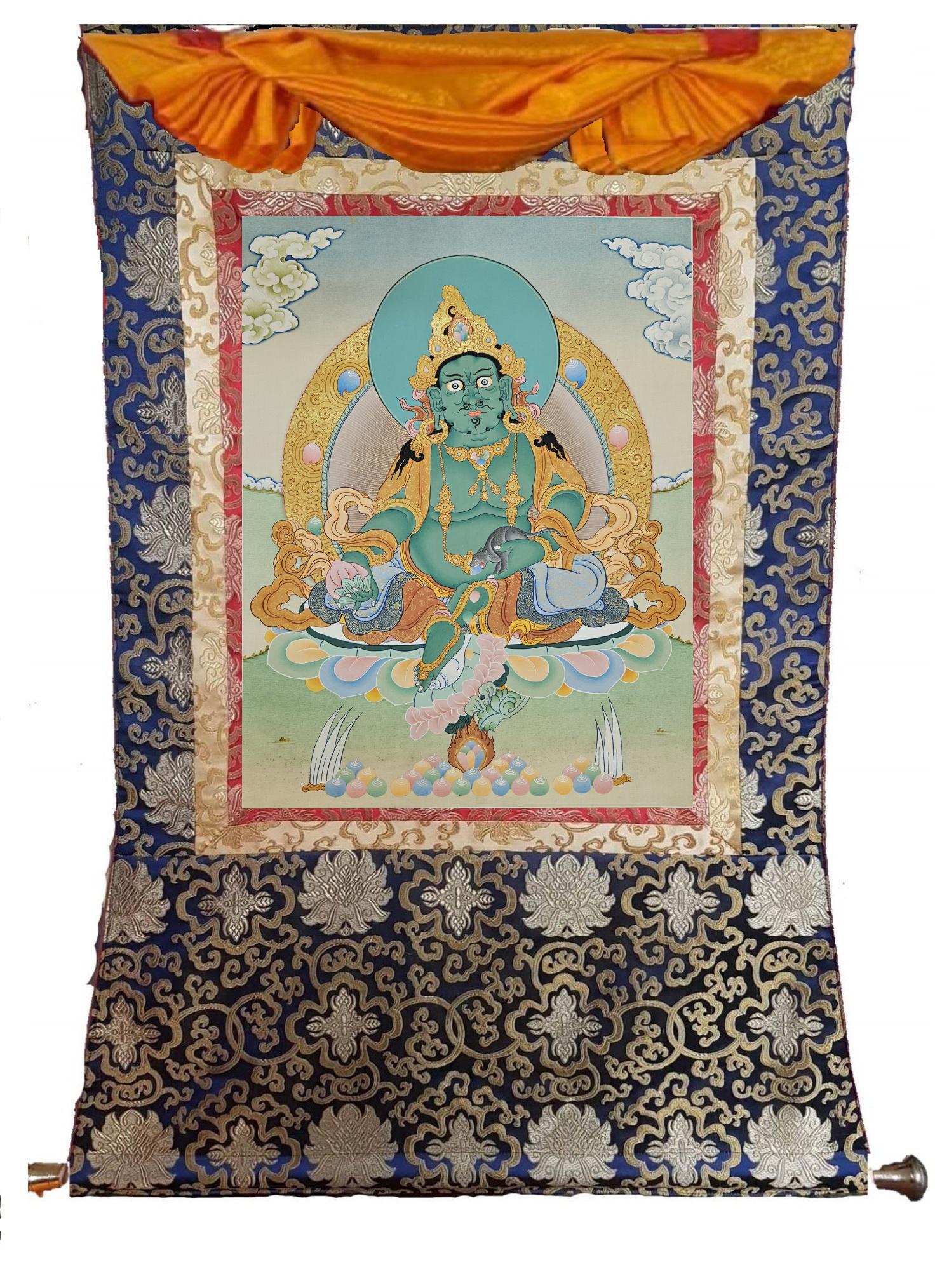 396. Green Jambhala or Zambhala Thangka (Thanka). Free Brocade / Free Shipping.
