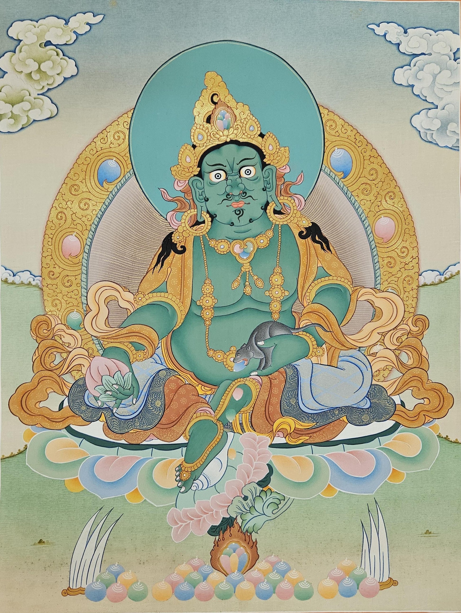 The stance of the Green Jambhala is active. His right leg stretches out like Tara, ready to leap to his feet, with his foot positioned atop a snail and a lotus flower. Meanwhile, his left leg is bent, adding a unique dynamic to his pose. Nehulay, a special kind of mongoose known to spew jewels from its mouth, rests in his left hand, while his right hand firmly holds a Citron fruit. The Citron is a beautiful fruit related to lemons, although much larger with a very thick skin. The Citron is widely used as a medicine.