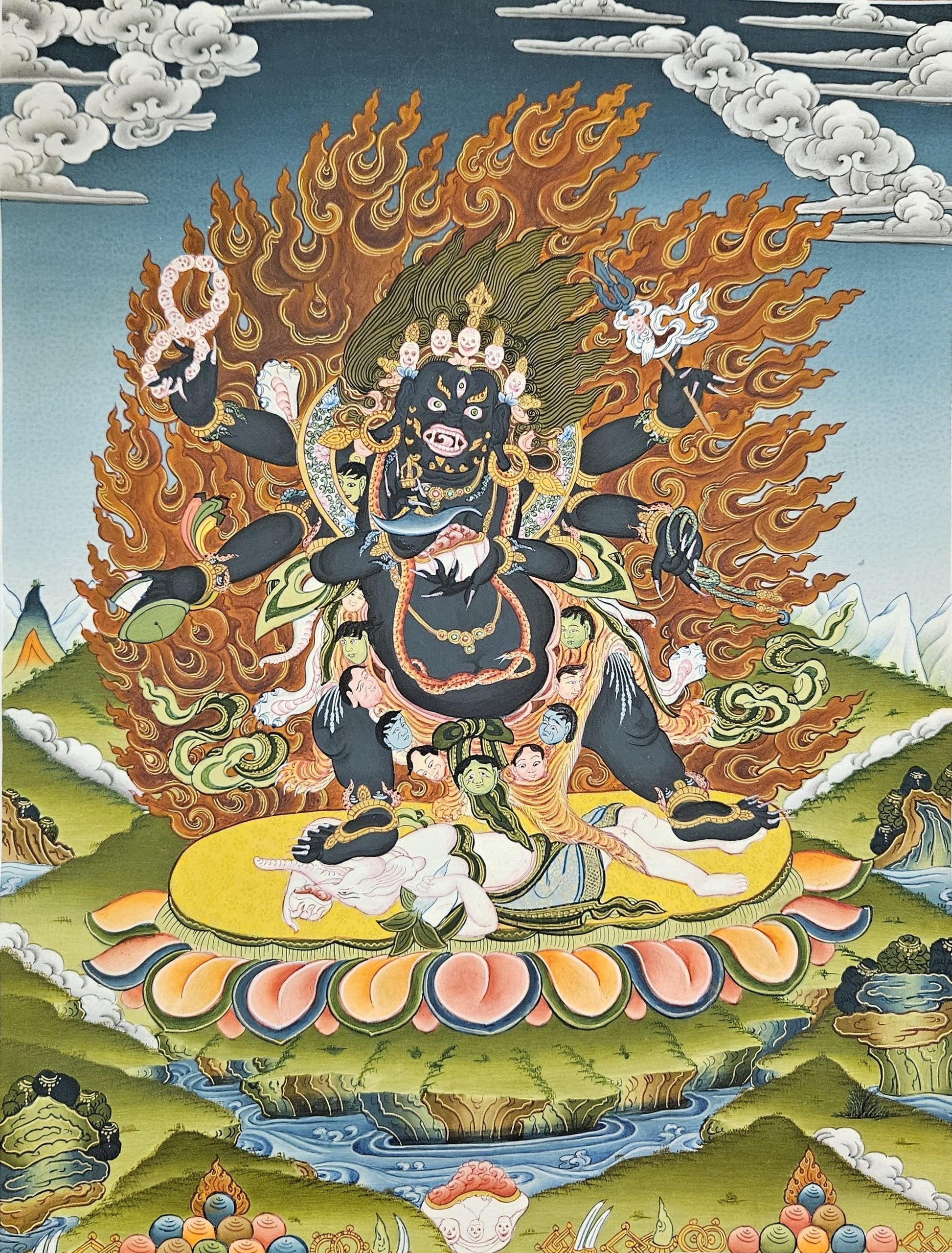 The Protector's body color is dark blue, symbolic of the changeless Dharmakaya. His three eyes symbolize his clear comprehension of the three times, and the vivid manifestation of the three bodies of Buddha. The crown of five skulls symbolize the five poisons-anger, desire. ignorance, Jealousy, and pride-transformed into five wisdoms. His six arms symbolize the completion to the six perfection-generosity, patience, morality, diligence, meditation, and wisdom. The tigug knife symbolizes the cutting of ego-attachment. The skull bowl filled with blood symbolizes the subjugation of evil ones. The rosary symbolizes his continuous activity for the benefit of beings. The damaru hand-drum symbolizes his power over the dakinis. His trident symbolizes his power over the three spheres-desire, form, and formless. The also symbolizes his action of bending those who break their vows. His two feet symbolize means and wisdom. That his left let is straight and his right leg bent symbolize his accomplishment of benefit to self and others. He tramples on the Binayaka, to symbolize his destruction and dispersal of great obstacles. The sun on which he stands symbolizes his illumination of the darkness of ignorance. The lotus seat symbolizes purity undefiled by samsara. The blazing fire symbolize his action to consume neurotic states of mind. The tiger skin he wear symbolizes the purification of desire: the elephant skin. Purification of pride: the snake, purification of anger. All his other ornaments symbolize that he has the complete qualities of the buddha.