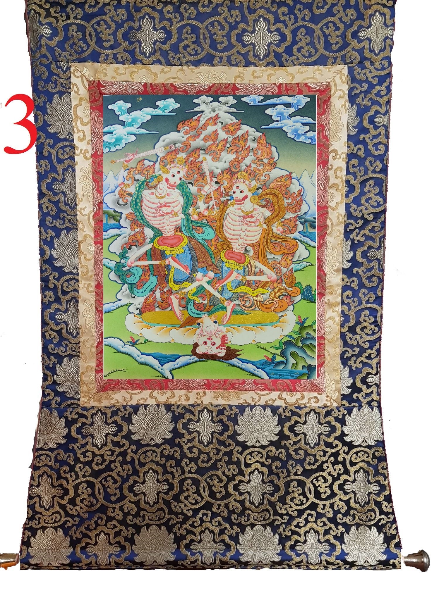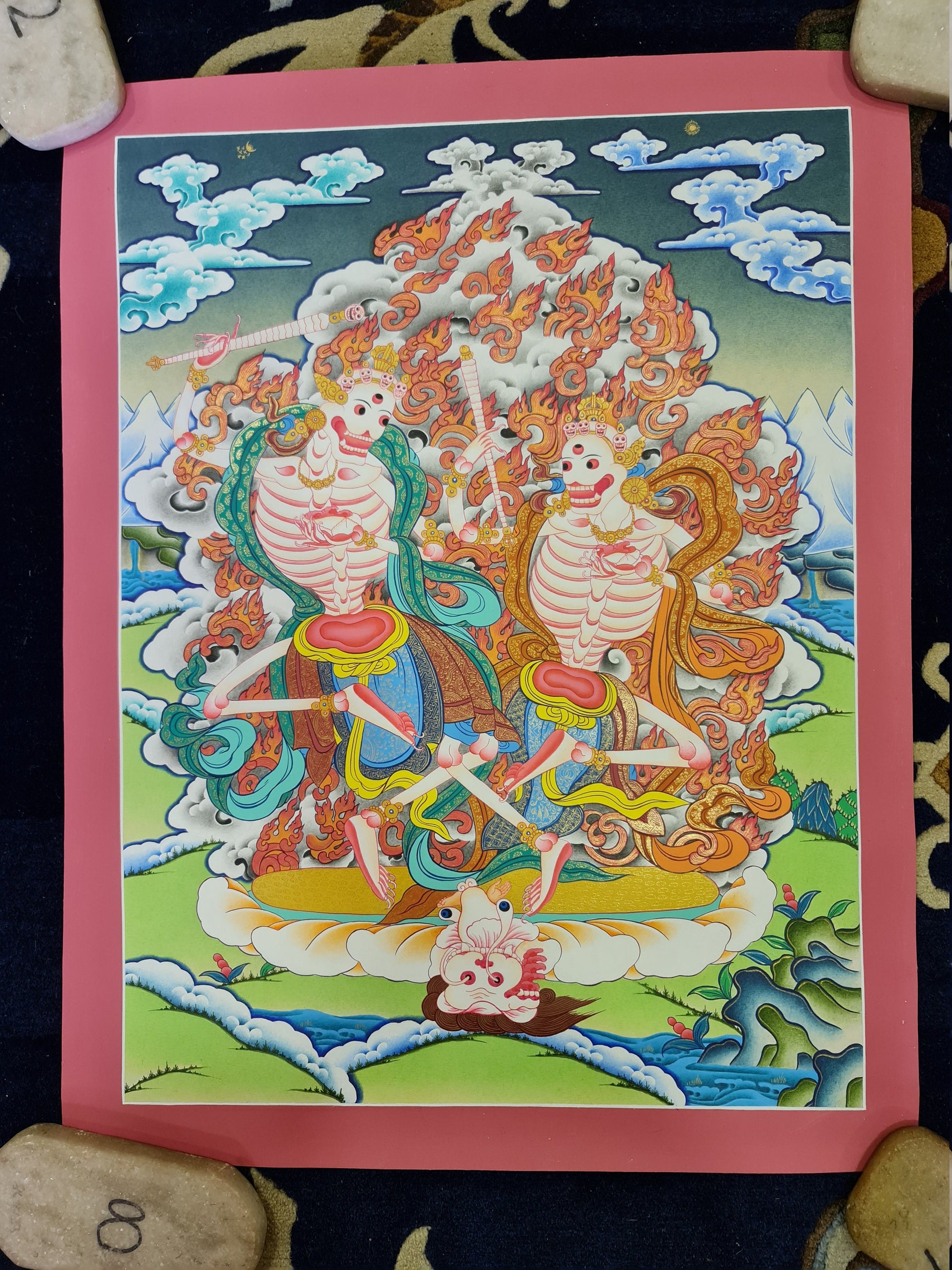 In the appearance of two identical skeletons they each have one face and two hands. With three round eyes and wide smiling mouths they glare with unmoving features. The two hands hold in the right a stick topped with a white skull and vajra and in the left a blood filled skullcup held to the heart. Adorned with skull crowns tipped with gold and jewel ornaments, silk fan decorations protruding from the ear slots, they wear silk scarves and skirts red in colour. With their legs interlocked the Father stands on a conch shell and the Mother on a cowrie, atop a flat sun disc and multi-coloured lotus seat surrounded by the flames of pristine awareness. Directly above is a white canopy of human ribs, leg and arm bones. At the edges stung through decorative white skulls intestines hang in loops against a dark background adorned with a delicate floral pattern. At the bottom left and right are two small square frames depicting charnel ground scenes.
