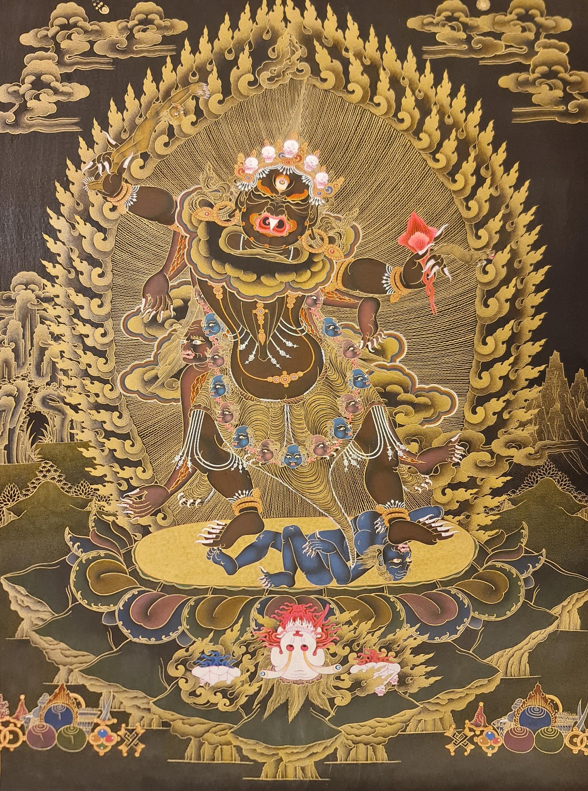 Ekajati, whose name means ‘one single birth’, or ‘one braid of hair’ is probably one of the fiercest and most powerful of the ‘dark’ goddesses, mamos or dakinis. She is found in both Buddhist and Hindu traditions. She has a special place in the Tibetan traditions of Bön and Dzogchen teachings as she is regarded as one of the three protectors or guardians the teachings. According to legends her right eye was damaged by Padmasambhava so that she could help him deal with Tibetan demons. In her Tibetan manifestation she is seen as having a chignon or bun of hair and only one eye – the latter being a nod to the legend that Padmasambhava pierced the other – but also indicative of non-dual vision, the lack of separation between the universe/creator and the self. Her single tooth shows that she destroys or eats through obstacles and the single breast feeds those who correctly follow the teachings and traditions that she protects. Like many images of the ‘dark’ goddesses, she is depicted naked or sometimes wearing a skin (in softer imagery a tiger skin, but in more wrathful imagery – a human skin!) and dancing on the corpse of the ego. Her headdress if often composed of skulls as is her necklace. What she hold in her hands can vary – skull cup, grigug, khatvanga or in some designs a corpse of a perverter of the teachings as her sceptre in one hand and the heart of an enemy or betrayer in the other. As one of the ‘21 Taras’ her energies are also seen as Mahachinatara (Dark Blue, Wrathful or Ugra Tara) and in Blue Tara (where she depicted with the head of a wolf). She is regarded as a liberator, with the power to remove fear and barriers on the path to enlightenment. Mantras and practices linked to Ekajati are kept secret or only released after an initiation process as many teachers accept that working with her energy can be destructive if a practitioner does not have the capacity to handle the effects. Disrespect, carelessness and laziness will be dealt with by her destroying egos and pushing a practitioner onwards to ultimate realization. This may sound like something one would aspire to, but the effect, without appropriate guidance and support would likely be fatal.